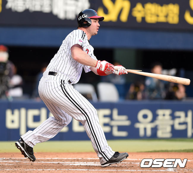 13일 잠실구장에서 열리는 ‘2015 타이어뱅크 KBO리그’ LG 트윈스와 NC 다이노스의 경기, 1회말 1사 3루 LG 한나한이 1타점 적시타를 날리고 있다.
