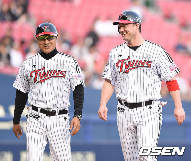 13일 잠실구장에서 열리는 ‘2015 타이어뱅크 KBO리그’ LG 트윈스와 NC 다이노스의 경기, 1회말 이닝종료 후 첫 타점을 신고한 LG 한나한이 최태원 코치와 이야기를 나누며 더그아웃으로 들어가고 있다.