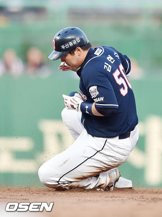 13일 오후 인천 SK행복드림구장에서 열린 '2015 타이어뱅크 KBO 리그' SK 와이번스와 두산 베어스의 경기, 2회초 두산 김현수가 우익수 앞 안타를 날린 후 2루에서 세이프 되고 있다.