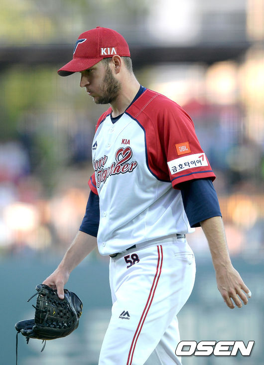 KIA 스틴슨이 1회초 수비를 마친 뒤 더그아웃으로 들어서고 있다.