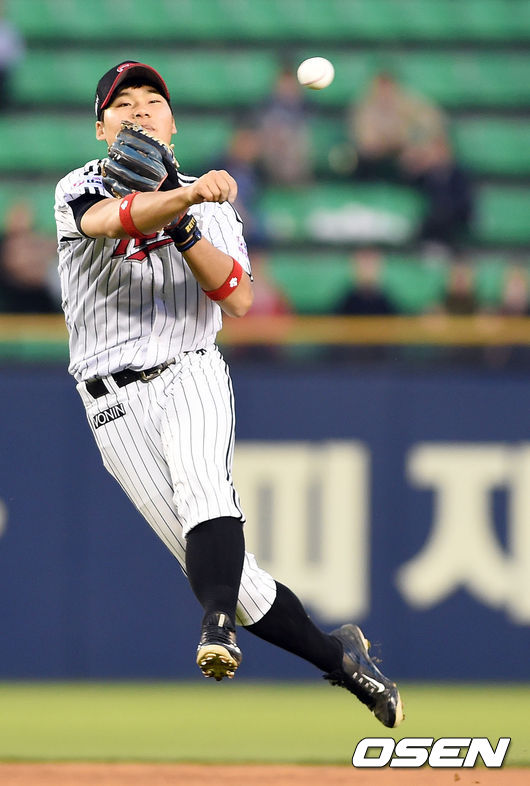 13일 잠실구장에서 열린 ‘2015 타이어뱅크 KBO리그’ LG 트윈스와 NC 다이노스의 경기, 2회말 1사 NC 박민우의 타석때 LG 박지규 2루수가 호수비 펼치며 1루로 송구하고 있다.
