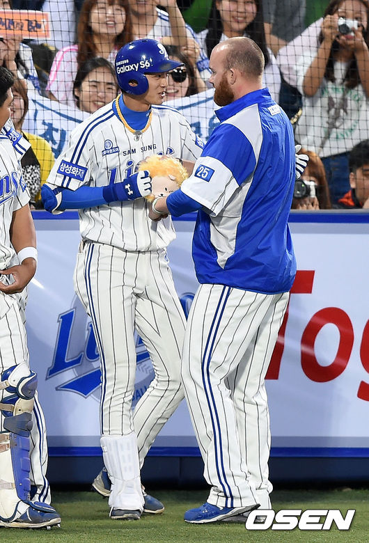 13일 오후 대구야구장에서 열린 '2015 타이어뱅크 KBO 리그' 삼성 라이온즈와 한화 이글스의 경기, 3회초 무사 1루에서 삼성 클로이드가 구자욱이 투런포를 날리고 받은 홈런인형을 달라며 손짓하고 있다.