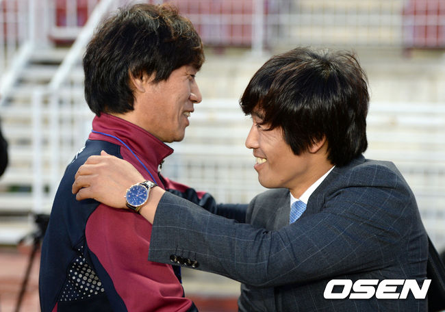 경기에 앞서 전남 김태영 코치와 수원 서정원 감독이 인사를 나누고 있다.