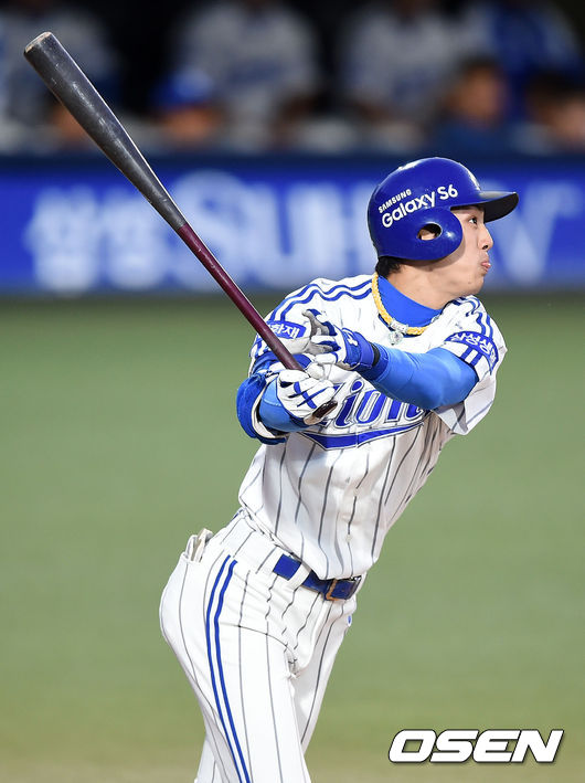 13일 오후 대구야구장에서 열린 '2015 타이어뱅크 KBO 리그' 삼성 라이온즈와 한화 이글스의 경기, 3회초 무사 1루에서 삼성 구자욱이 투런포를 날리고 있다.