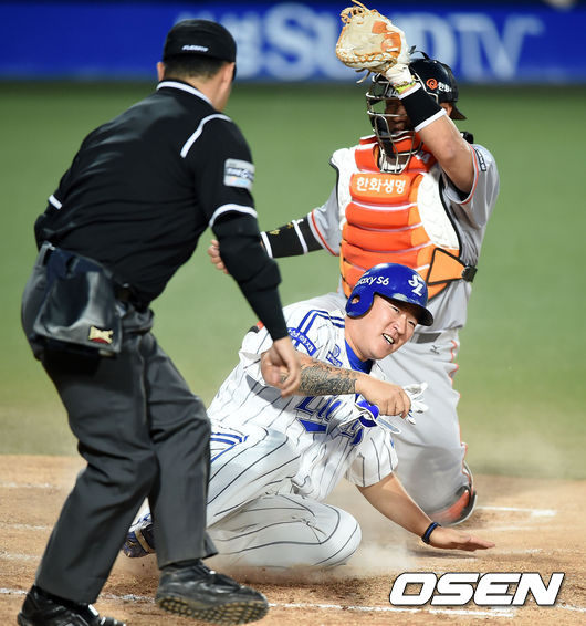13일 오후 대구야구장에서 열린 '2015 타이어뱅크 KBO 리그' 삼성 라이온즈와 한화 이글스의 경기, 3회말 2사 1,2루에서 삼성 최형우가 박해민의 적시타에 홈에서 한화 조인성에 태그아웃 당하고 있다.