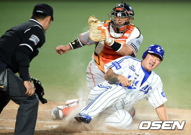 13일 오후 대구야구장에서 열린 '2015 타이어뱅크 KBO 리그' 삼성 라이온즈와 한화 이글스의 경기, 3회말 2사 1,2루에서 삼성 최형우가 박해민의 적시타에 홈에서 한화 조인성에 태그아웃 당하고 있다.