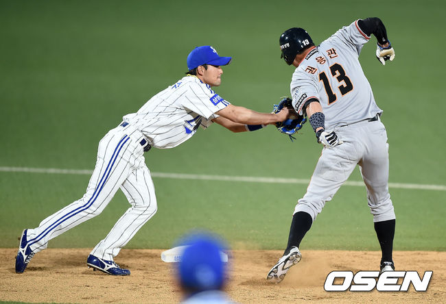 13일 오후 대구야구장에서 열린 '2015 타이어뱅크 KBO 리그' 삼성 라이온즈와 한화 이글스의 경기, 4회초 2사 1,3루에서 한화 권용관이 삼성 김상수에 태그아웃 당하며 2루 도루에 실패하고 있다.