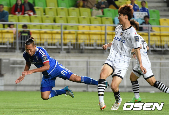후반 수원 정대세가 전남 임종은의 발에 걸려 넘어지고 있다.