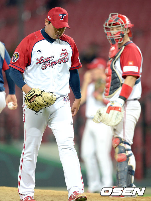 7회초 1사 2루 KIA 유창식이 kt 하준호에게 적시타를 허용한 뒤 강판되고 있다.