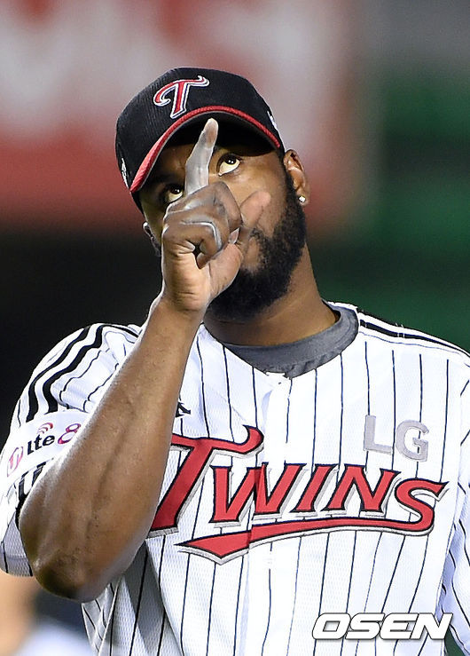 13일 잠실구장에서 열린 ‘2015 타이어뱅크 KBO리그’ LG 트윈스와 NC 다이노스의 경기, 8회초 2사 1,3루 위기를 넘긴 LG 선발투수 소사가 하늘을 가르키며 환호하고 있다.