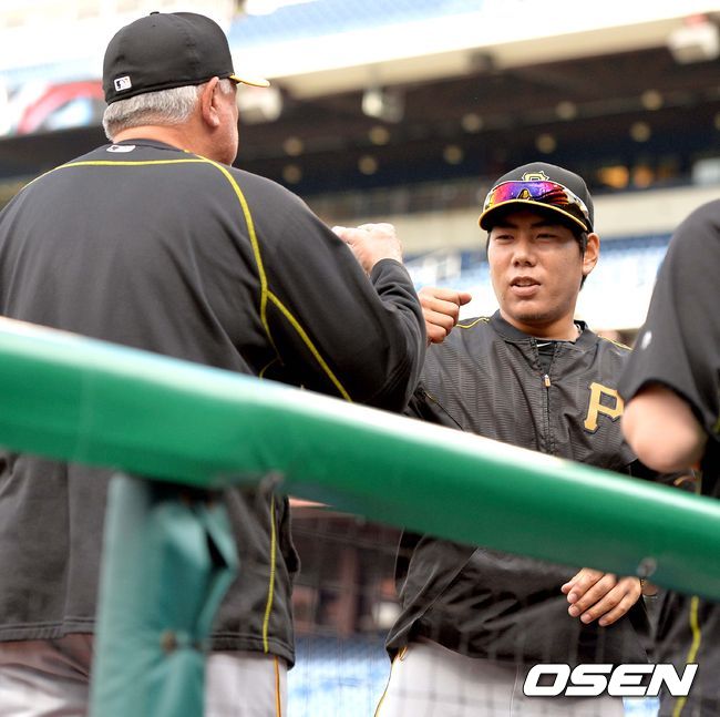 14일(한국시간) 미국 펜실베니아주 필라델피아 시티즌스 뱅크 파크에서 열리는 '2015 메이저리그' 필라델피아 필리스와 피츠버그 파이어리츠의 경기를 앞두고, 피츠버그 강정호와 클린트 허들 감독이 인사를 나누고 있다.