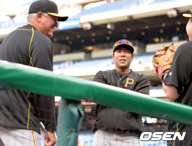 14일(한국시간) 미국 펜실베니아주 필라델피아 시티즌스 뱅크 파크에서 열리는 '2015 메이저리그' 필라델피아 필리스와 피츠버그 파이어리츠의 경기를 앞두고, 피츠버그 강정호와 클린트 허들 감독이 인사를 나누고 있다.