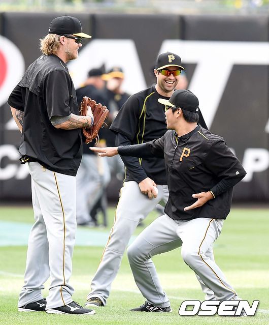 14일(한국시간) 미국 펜실베니아주 필라델피아 시티즌스 뱅크 파크에서 열리는 '2015 메이저리그' 필라델피아 필리스와 피츠버그 파이어리츠의 경기를 앞두고, 피츠버그 강정호가 닐 워커를 비롯한 동료들과 태권도 자세를 취하며 장난을 치고 있다.