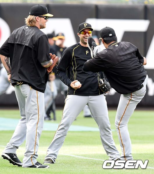 14일(한국시간) 미국 펜실베니아주 필라델피아 시티즌스 뱅크 파크에서 열리는 '2015 메이저리그' 필라델피아 필리스와 피츠버그 파이어리츠의 경기를 앞두고, 피츠버그 강정호가 닐 워커를 비롯한 동료들과 태권도 자세를 취하며 장난을 치고 있다.