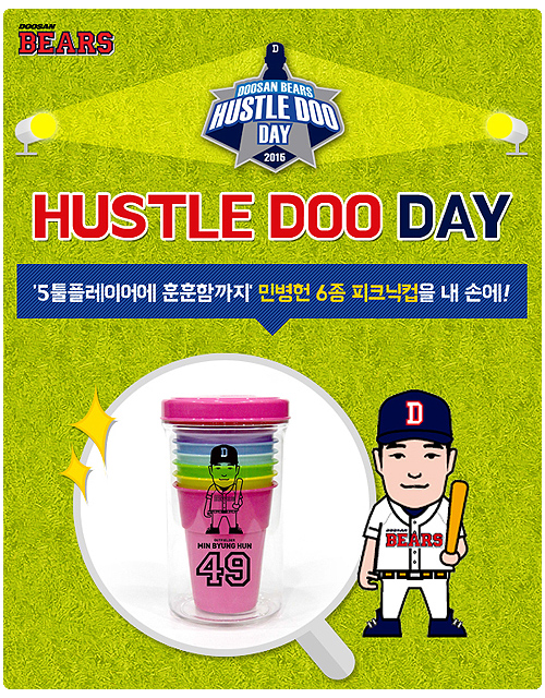 19일 실시하는 시즌 네번째 '허슬두데이'의 주인공은 '5툴 플레이어' 민병헌. 이날 두산베어스는 특정 관중석(레드석 202-203 블럭)을 '허슬두데이존'으로 편성, 이 좌석을 이용하는 팬들에게 민병헌의 캐리커처 피크닉 컵 세트를 증정하고, 민병헌에게 직접 응원 메시지를 보내는 전광판 라이브 이벤트에 참여할 수 있는 기회도 함께 제공한다.