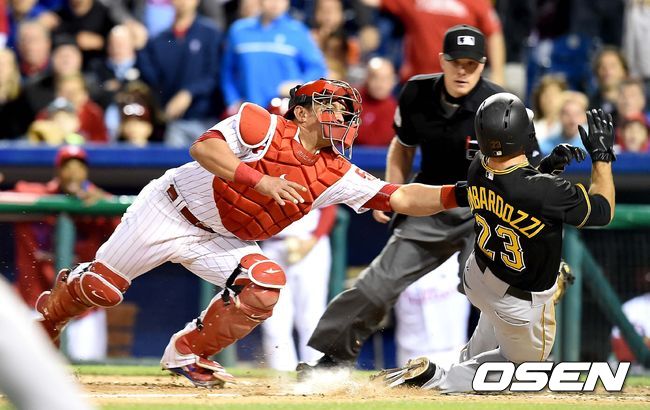 9회초 피츠버그 공격 1사 3루 상황 조디 머서의 우익수 파울 플라이 아웃 때, 필라델피아 제프 프랑코어의 홈 송구가 그대로 카를로스 루이스에게 송구되어 주자 롬바르도찌가 홈에서 아웃되고 있다. /dreamer@osen.co.kr