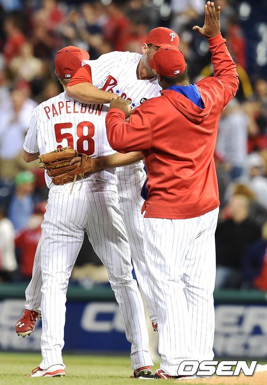 경기 종료 후 필라델피아 마무리투수 파펠본이 우익수 제프 프랑코어를 번쩍 들며 기뻐하고 있다. /dreamer@osen.co.kr