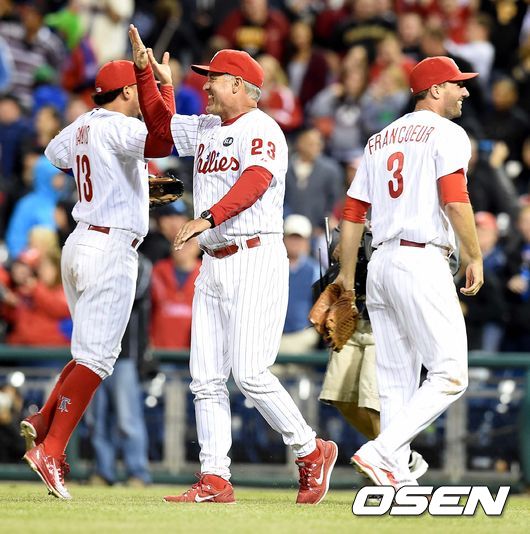 경기 종료 후 필라델피아 라인 샌드버그 감독이 제프 프랑코어와 프레디 갈비스 등 선수들과 승리의 하이파이브를 나누고 있다. /dreamer@osen.co.kr