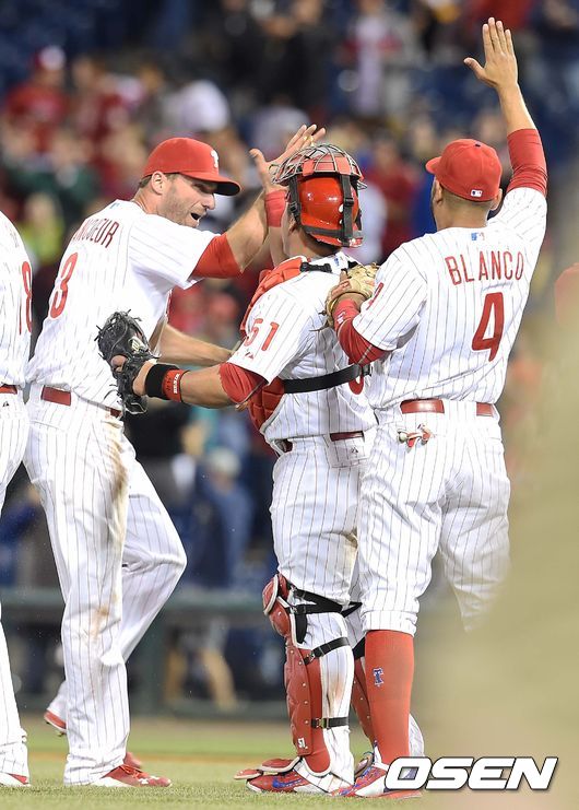 경기 종료 후 필라델피아 우익수 제프 프랑코어와 포수 카를로스 루이스가 승리의 하이파이브를 나누고 있다. /dreamer@osen.co.kr