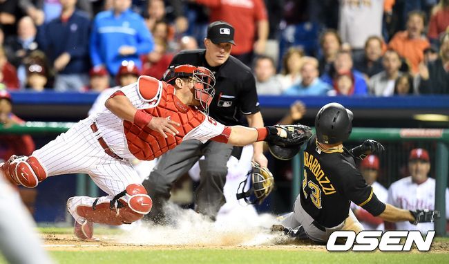 9회초 피츠버그 공격 1사 3루 상황 조디 머서의 우익수 파울 플라이 아웃 때, 필라델피아 제프 프랑코어의 홈 송구가 그대로 카를로스 루이스에게 송구되어 주자 롬바르도찌가 홈에서 아웃되고 있다. /dreamer@osen.co.kr