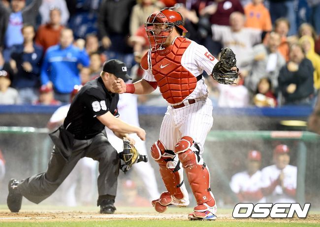 9회초 피츠버그 공격 1사 3루 상황 조디 머서의 우익수 파울 플라이 아웃 때, 필라델피아 제프 프랑코어의 홈 송구가 그대로 카를로스 루이스에게 송구되어 주자 롬바르도찌가 홈에서 아웃됐다. 환호하는 필라델피아 포수 카를로스 루이스. /dreamer@osen.co.kr
