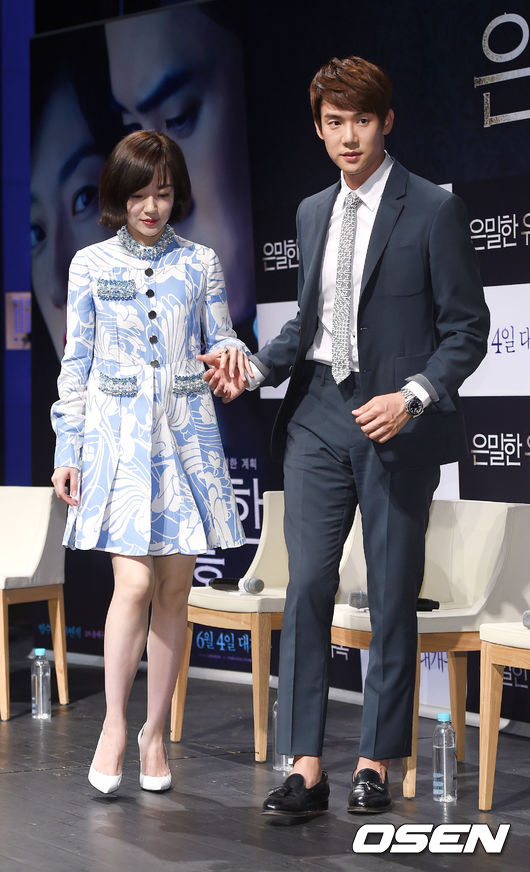 14일 서울 압구정 CGV에서 진행된 영화 '은밀한 유혹'(윤재구 감독) 제작보고회에서 배우 유연석이 임수정으 손을 잡고 퇴장하고 있다.