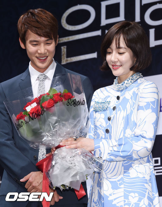 14일 서울 압구정 CGV에서 진행된 영화 '은밀한 유혹'(윤재구 감독) 제작보고회에서 배우 임수정이 유연석에게 꽃다발 선물을 받고 있다.