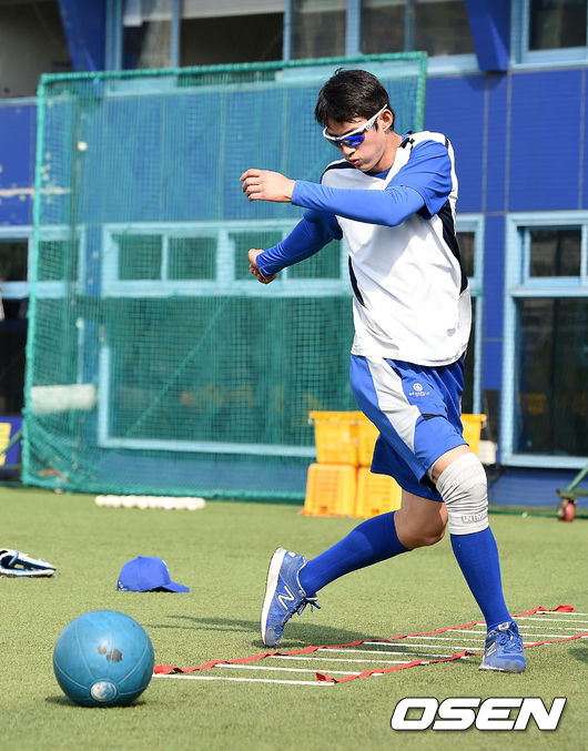 14일 오후 대구야구장에서 열린 '2015 타이어뱅크 KBO 리그' 삼성 라이온즈와 한화 이글스의 경기, 경기에 앞서 삼성 구자욱이 훈련을 하고 있다.