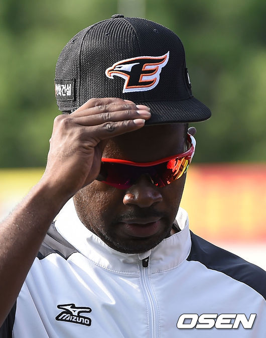 14일 오후 대구야구장에서 열린 '2015 타이어뱅크 KBO 리그' 삼성 라이온즈와 한화 이글스의 경기, 경기에 앞서 한화 유먼이 외야에서 훈련을 마치고 더그아웃으로 향하고 있다.
