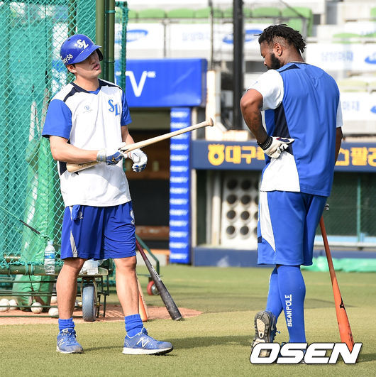 14일 오후 대구야구장에서 열린 '2015 타이어뱅크 KBO 리그' 삼성 라이온즈와 한화 이글스의 경기, 경기에 앞서 삼성 김상수가 나바로에 장난을 치고 있다.
