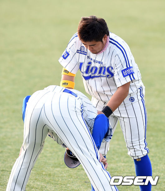 14일 오후 대구야구장에서 열린 '2015 타이어뱅크 KBO 리그' 삼성 라이온즈와 한화 이글스의 경기, 경기에 앞서 삼성 박석민이 이승엽에 장난을 치고 있다.