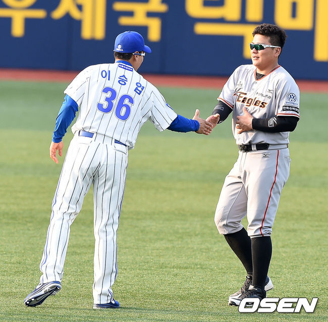 14일 오후 대구야구장에서 열린 '2015 타이어뱅크 KBO 리그' 삼성 라이온즈와 한화 이글스의 경기, 경기에 앞서 삼성 이승엽과 한화 김태균이 반갑게 인사를 나누고 있다.