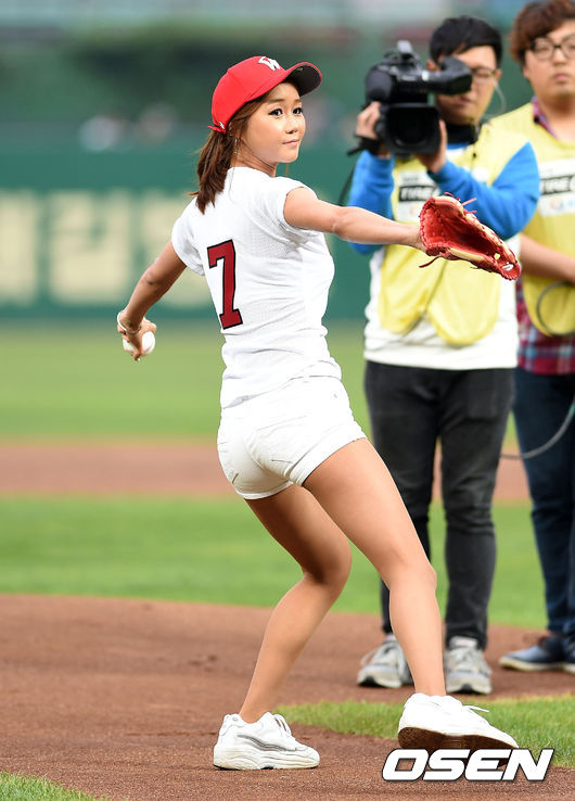 경기에 앞서 SK 치어리더 배수현이 시구를 하고 있다.