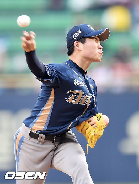 14일 오후 서울 잠실야구장에서 열린 '2015 타이어뱅크 KBO 리그' LG 트윈스와 NC 다이노스의 경기, NC 선발 이재학이 힘차게 공을 뿌리고 있다.