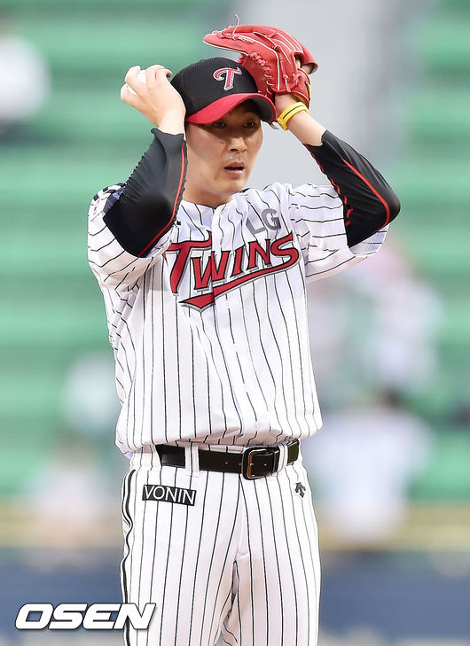 14일 오후 서울 잠실야구장에서 열린 '2015 타이어뱅크 KBO 리그' LG 트윈스와 NC 다이노스의 경기, LG 선발 우규민이 모자를 고쳐쓰고 있다.