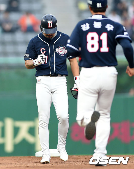 1회초 1사 만루에서 두산 오재원이 2타점 적시타를 치고 환호하고 있다.