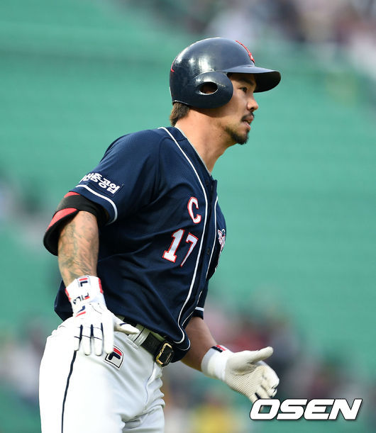 1회초 1사 만루에서 두산 오재원이 2타점 적시타를 치고 그라운드를 달리고 있다.