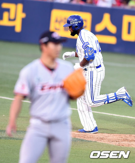 14일 오후 대구야구장에서 열린 '2015 타이어뱅크 KBO 리그' 삼성 라이온즈와 한화 이글스의 경기, 1회말 무사에서 삼성 나바로가 솔로포를 날리고 세리머니를 하고 있다.