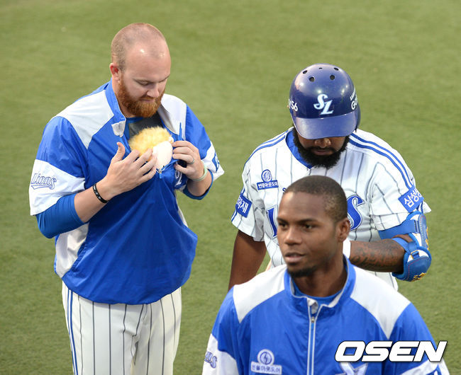 14일 오후 대구야구장에서 열린 '2015 타이어뱅크 KBO 리그' 삼성 라이온즈와 한화 이글스의 경기, 1회말 무사에서 삼성 나바로가 솔로포를 날리고 클로이드에게 홈런 인형을 건네고 있다.