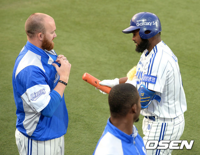 14일 오후 대구야구장에서 열린 '2015 타이어뱅크 KBO 리그' 삼성 라이온즈와 한화 이글스의 경기, 1회말 무사에서 삼성 나바로가 솔로포를 날리고 클로이드에게 홈런 인형을 건네고 있다.