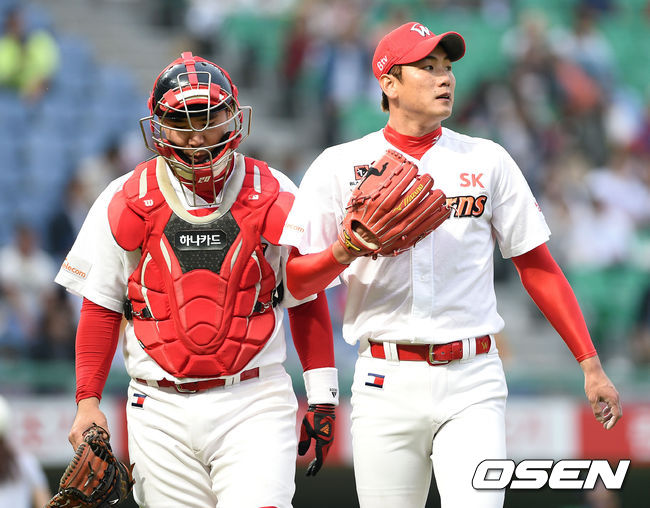 1회말 공수교대때 SK 이재원과 김광현이 더그아웃으로 가고 있다.