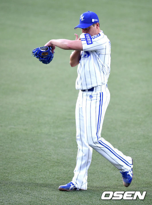 14일 오후 대구야구장에서 열린 '2015 타이어뱅크 KBO 리그' 삼성 라이온즈와 한화 이글스의 경기, 1회초 3실점을 허용한 삼성 장원삼이 수비를 마치고 더그아웃으로 향하고 있다.
