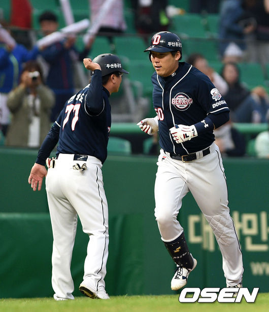 2회초 1사 1,3루에서 두산 김현수가 좌월 스리런 홈런을 치고 전형도 코치와 하이파이브를 하고 있다.