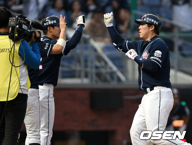 2회초 1사 1,3루에서 두산 김현수가 좌월 스리런 홈런을 치고 홈에서 김재호 하이파이브를 하고 있다.