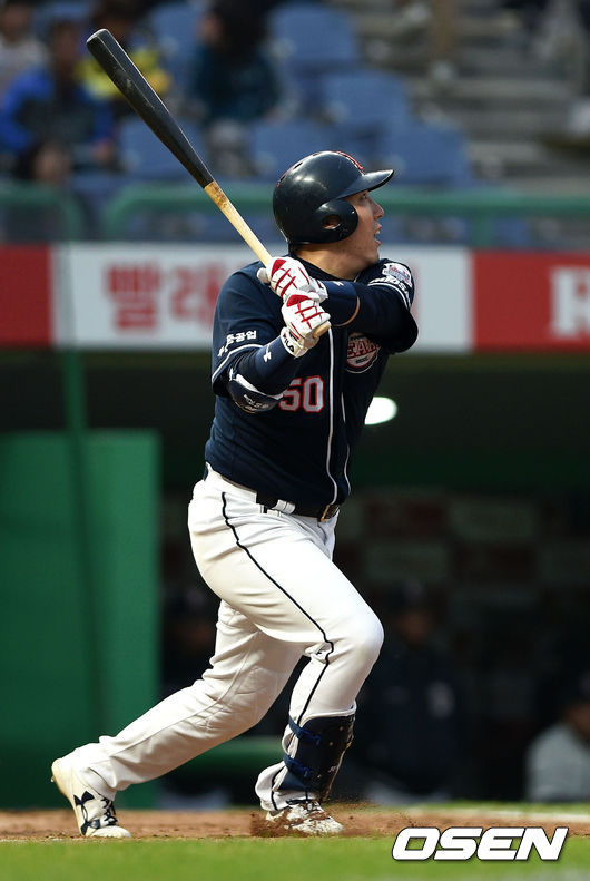 2회초 1사 1,3루에서 두산 김현수가 좌월 스리런 홈런을 치고 있다.