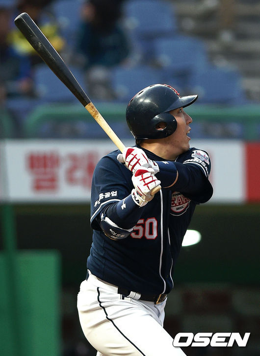 2회초 1사 1,3루에서 두산 김현수가 좌월 스리런 홈런을 치고 있다.