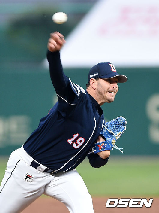 1회말 무사에서 두산 선발투수 마야가 힘차게 공을 던지고 있다.
