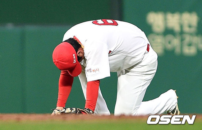 2회초 무사 1,2루에서 두산 민병헌의 타구를 잡는 과정에서 넘어진 SK 김성현이 고통스러워하고 있다.