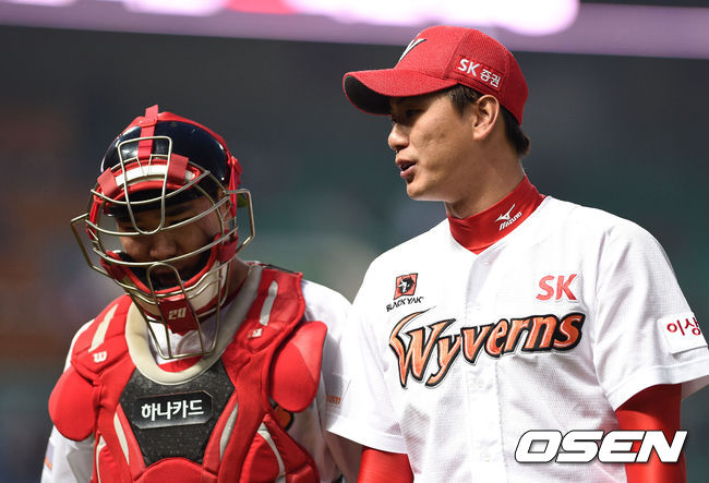 3회초 1사 1루에서 두산 민병헌을 병살타로 처리한 SK 이재원과 김광현이 더그아웃으로 가며 이야기를 나누고 있다.