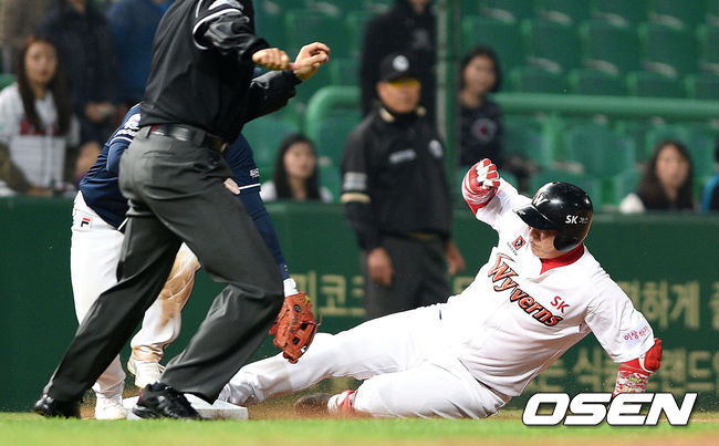 6회말 1사 1,2루에서 SK 정상호가 2타점 적시 3루타를 치고 슬라이딩을 하고 있다.